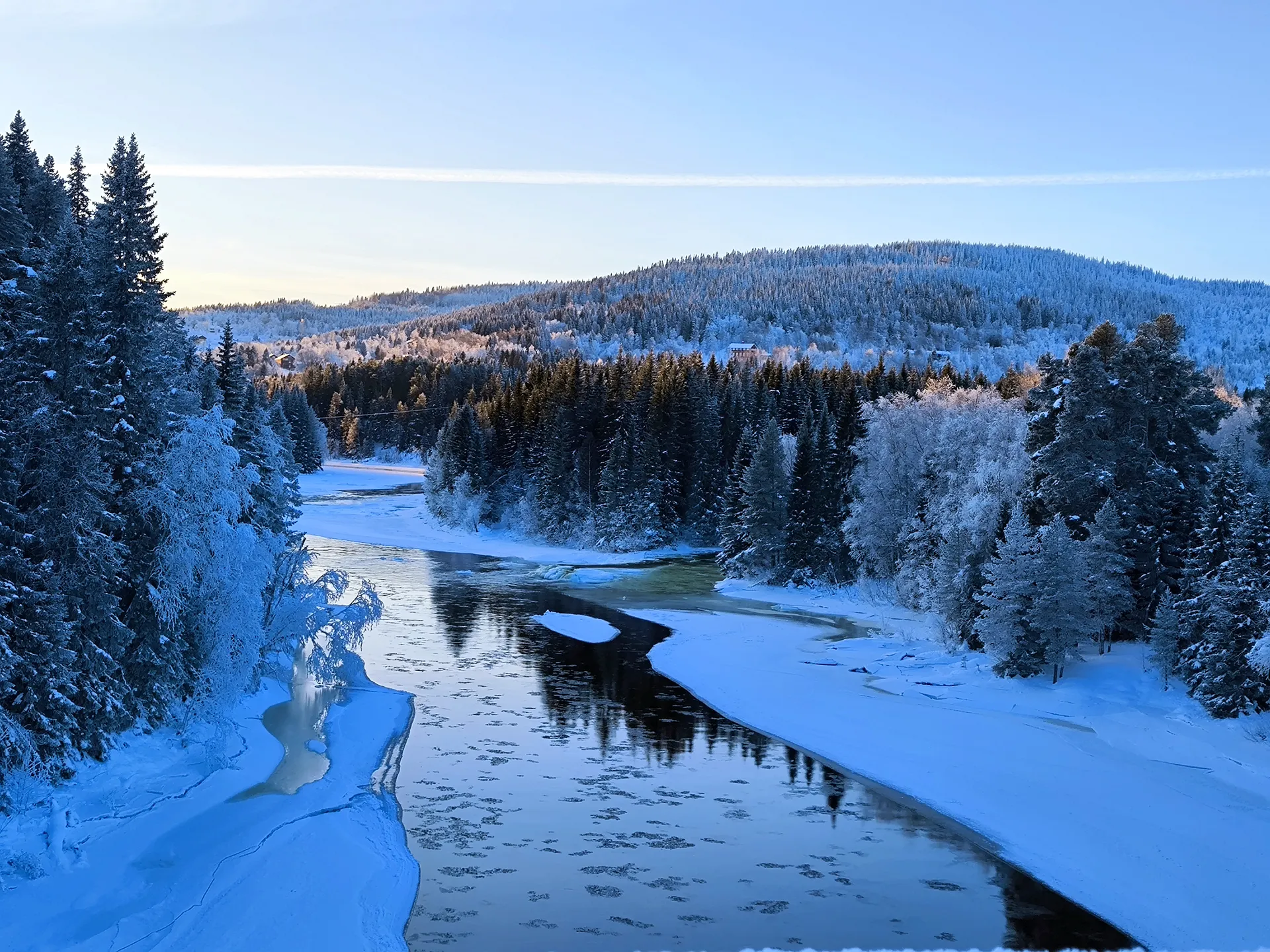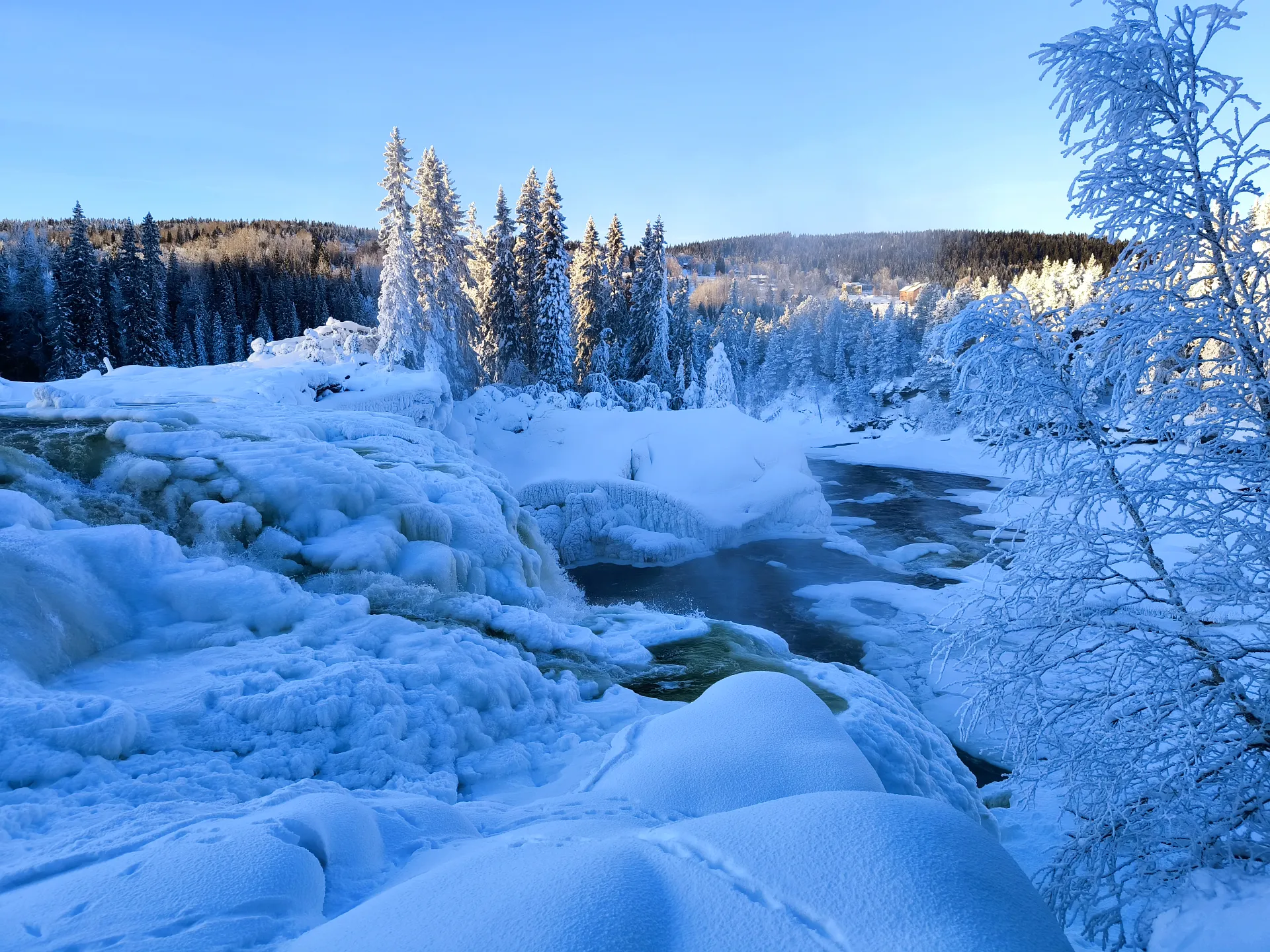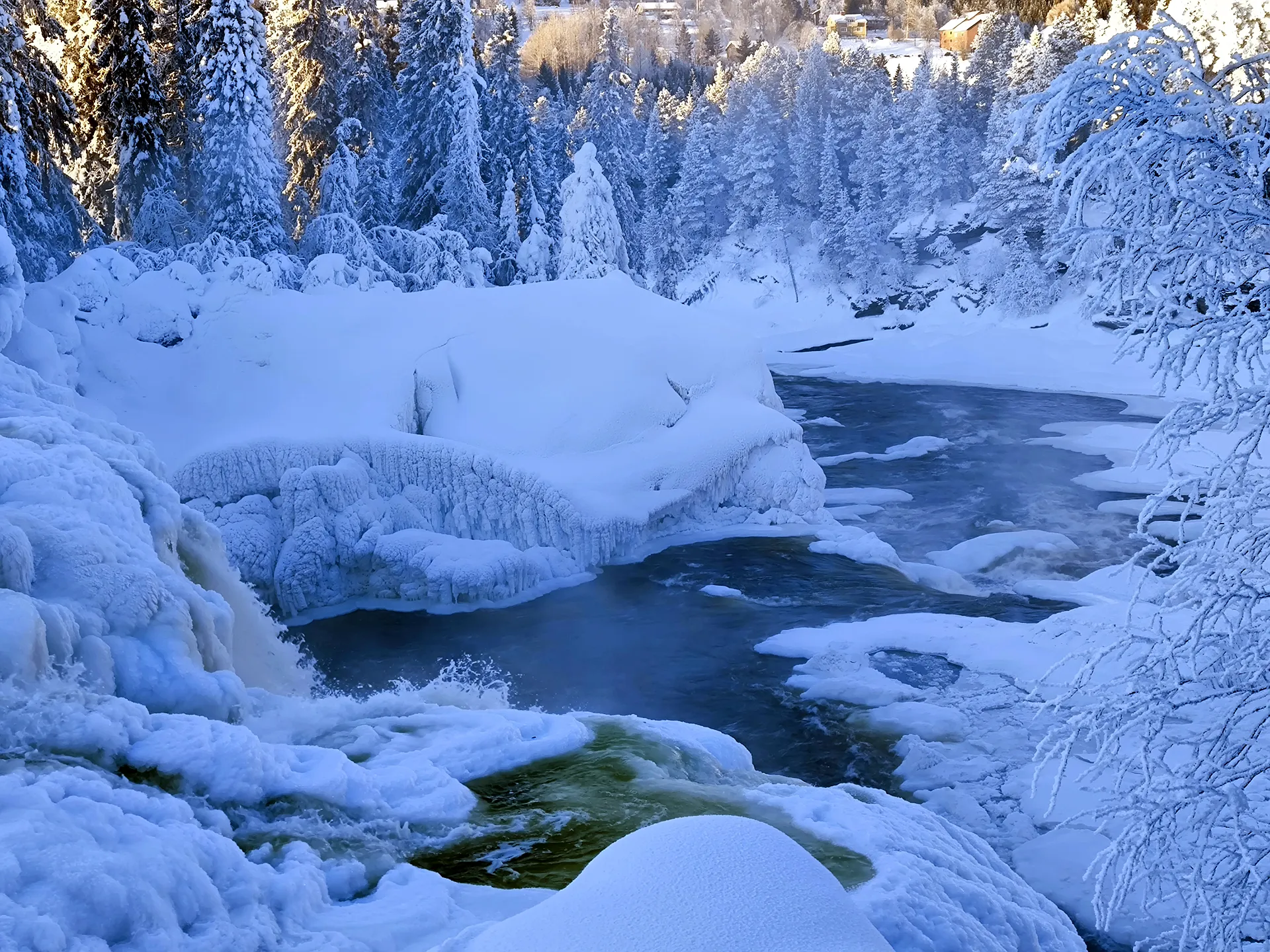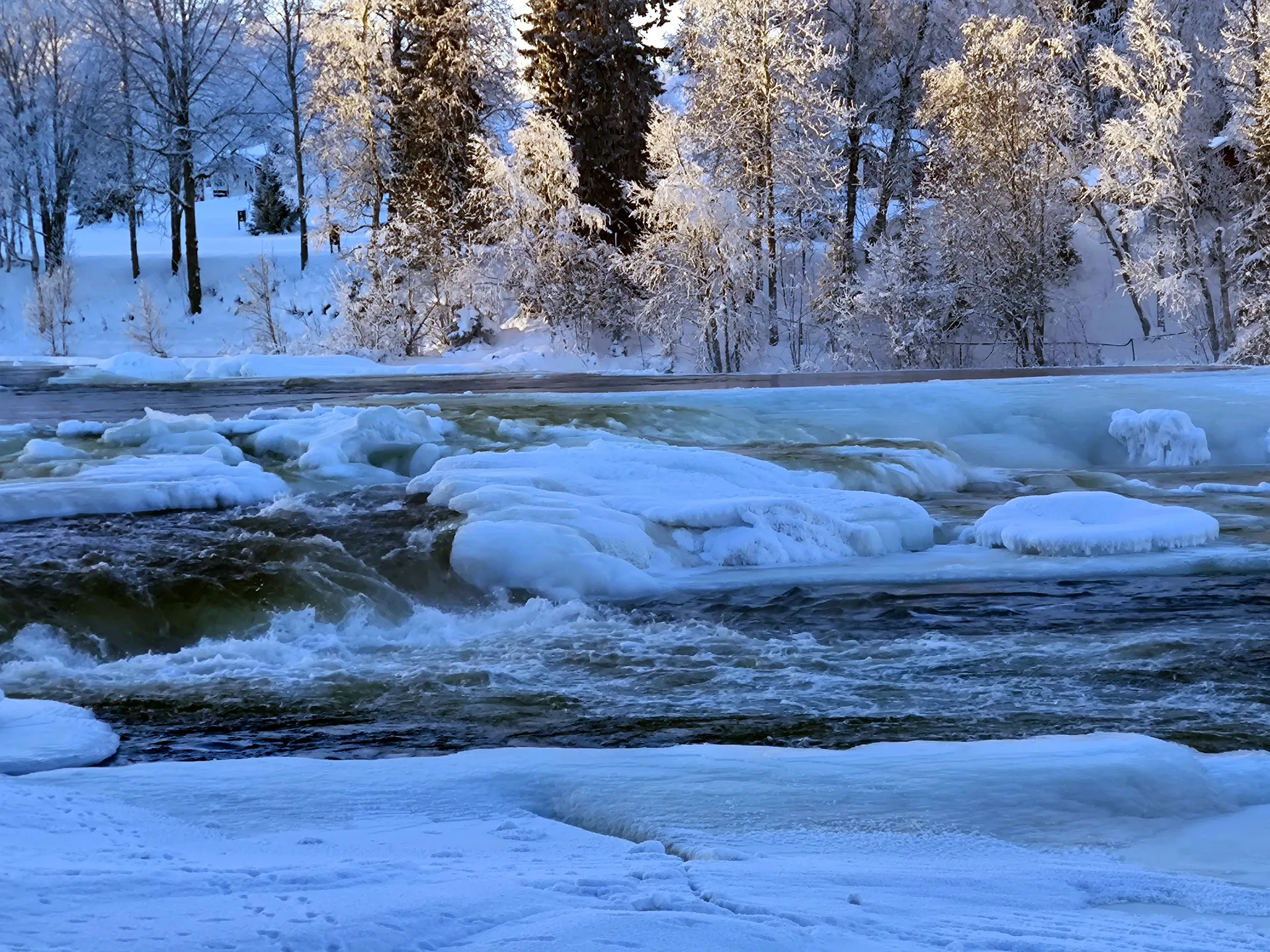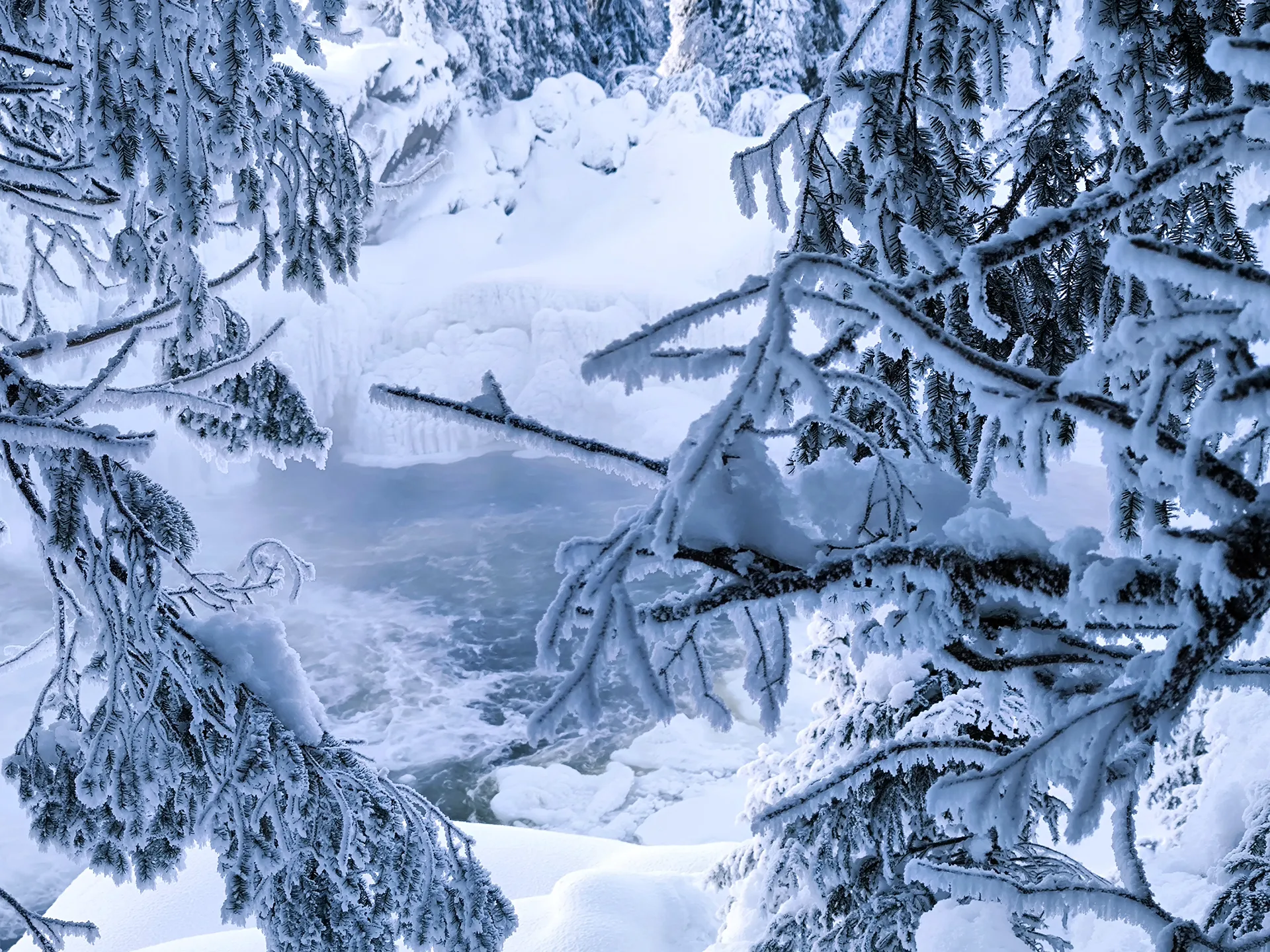 Keď som dorazil na miesto, čakal ma malý šok: z tejto strany rieky neexistovala žiadna prístupová cesta. V duchu som si povedal: „Mal som ísť z druhej strany…“ 😊 A tak nezostávalo nič iné, len sa brodiť hlbokým snehom dole po strmom zráze, aby som sa k vodopádu dostal bližšie. Už samotný zostup bol zážitok. Zabudol som, samozrejme, že nemám zaviazané zimné topánky. Po pár krokoch som ich mal plné snehu, čo pri mínus 20 °C nebolo nič príjemné, no túžba vidieť zamrznutý vodopád ma poháňala vpred.