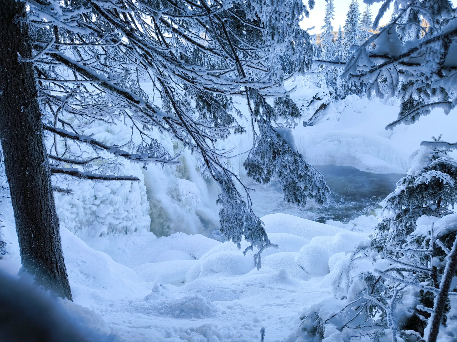 Keďže som nezvolil správny smer, nedostal som sa na miesto, kde by som videl vodopád priamo „spredu“. Na hrdinu som sa nehral – zráz bol neupravený a hrozilo, že sa kedykoľvek môžem skĺznuť do ľadovej vody. Ale aj z miest, kde sa bežný turista len tak ľahko v zime nedostane, bol pohľad ohromujúci a určite nezabudnuteľný.