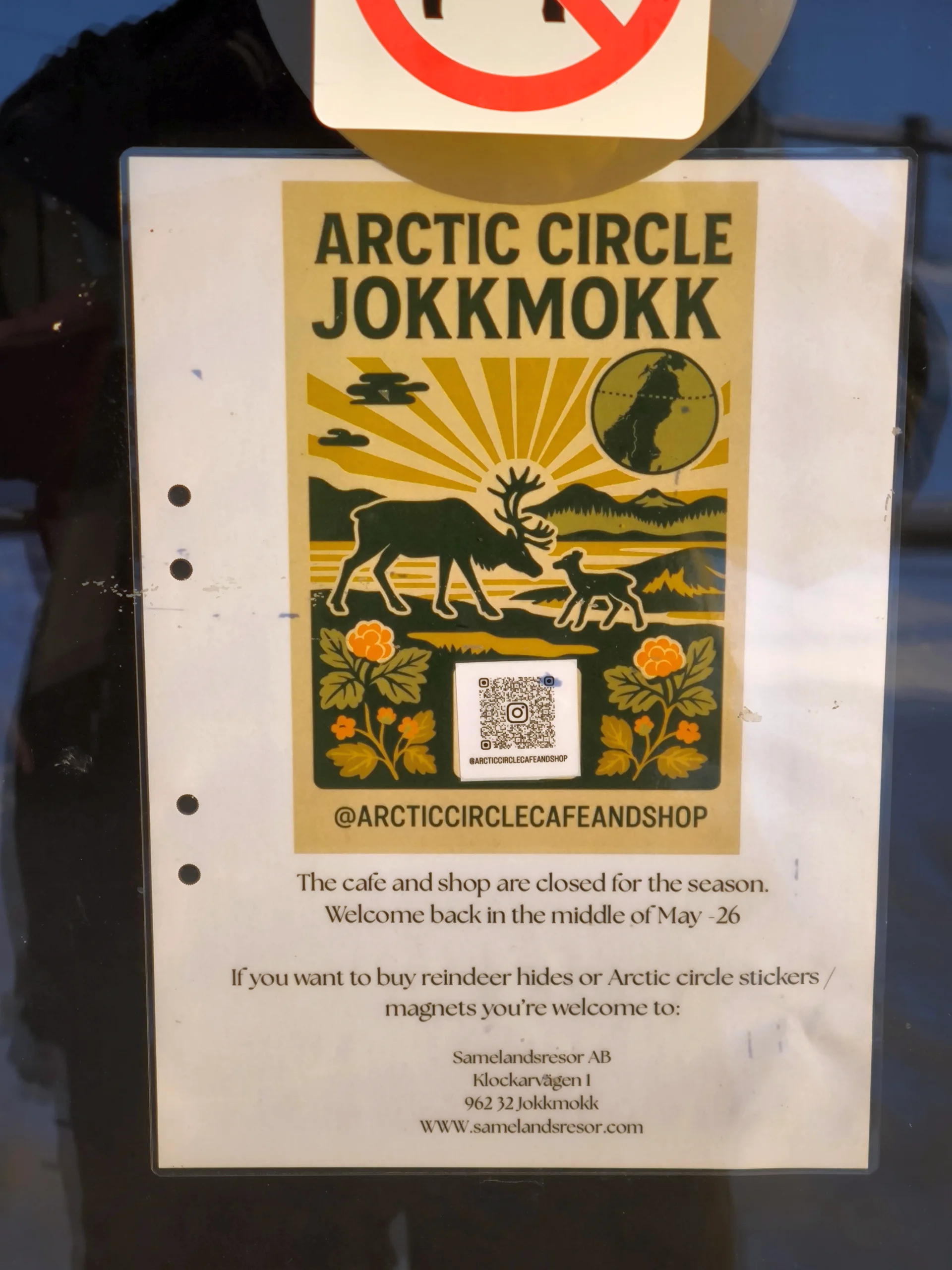 Zapadajúce slnko sa pomaly dotýkalo horizontu. Odfotil som informačné tabule, prázdne parkovisko, aj malý obchodík s kaviarňou. Tá bola zatvorená. Tentoraz som si teda kávu priamo na polárnom kruhu nevychutnal 😊 Možno nabudúce.
