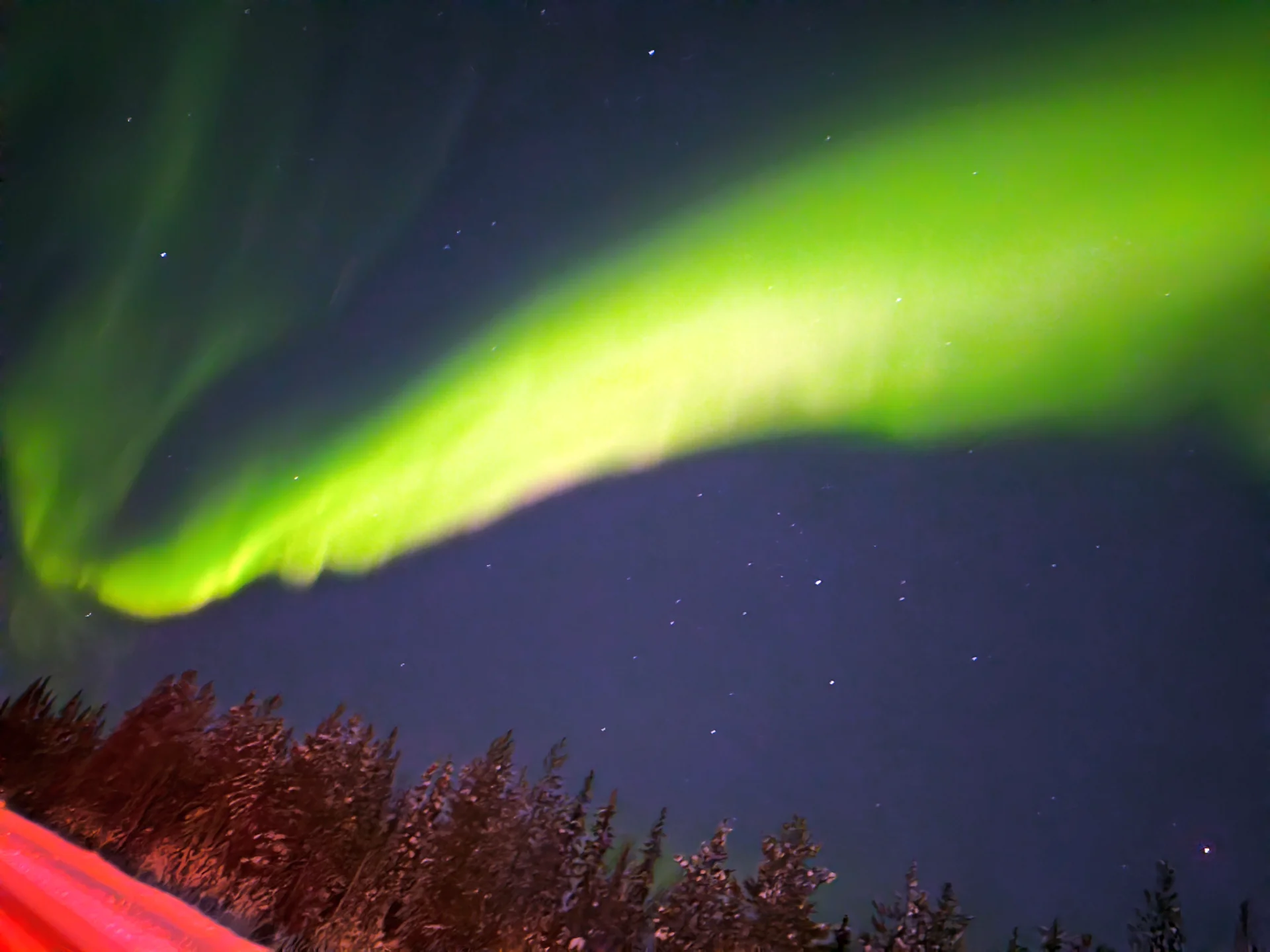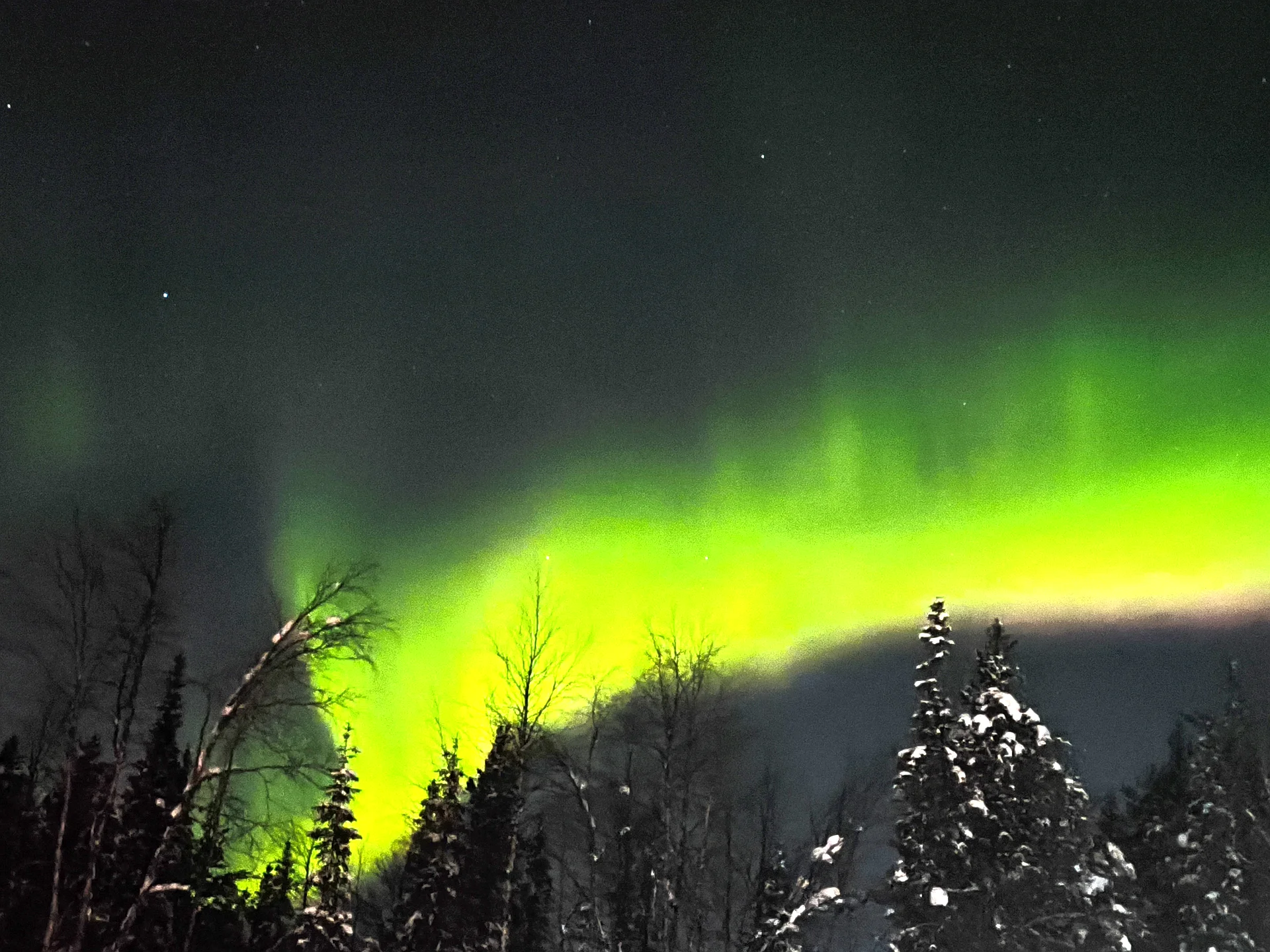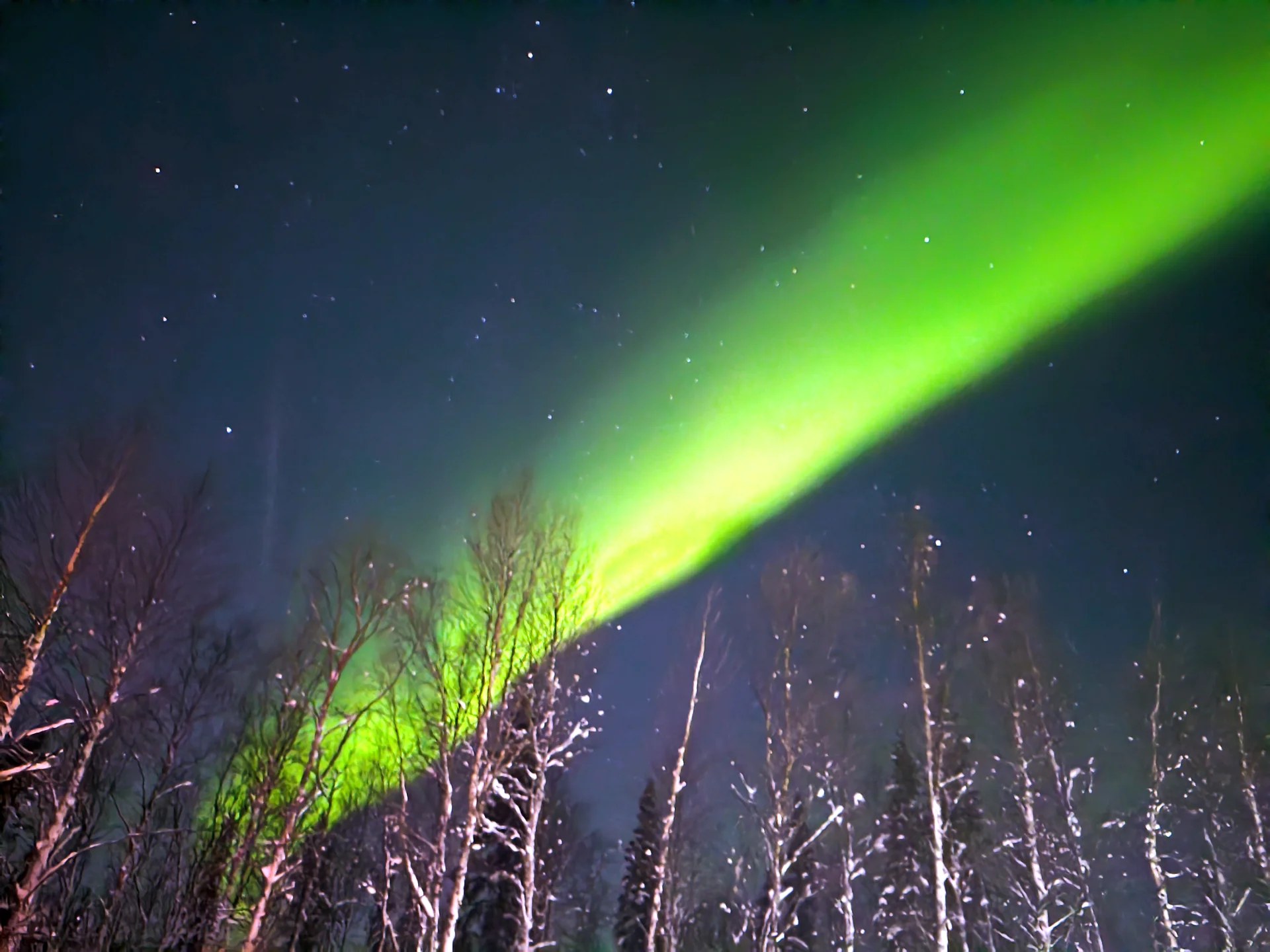 Keď bolo auto nabité, vyrazil som späť. Po pár minútach ma čakalo prekvapenie – polárna žiara. Bola však iná než tie predošlé. Tvoril ju jeden súvislý, meandrujúci pás, tiahnuci sa kilometre nad mojou hlavou. A ja som mal pocit, že jazdím pod nekonečnou zelenkastou riekou na oblohe.