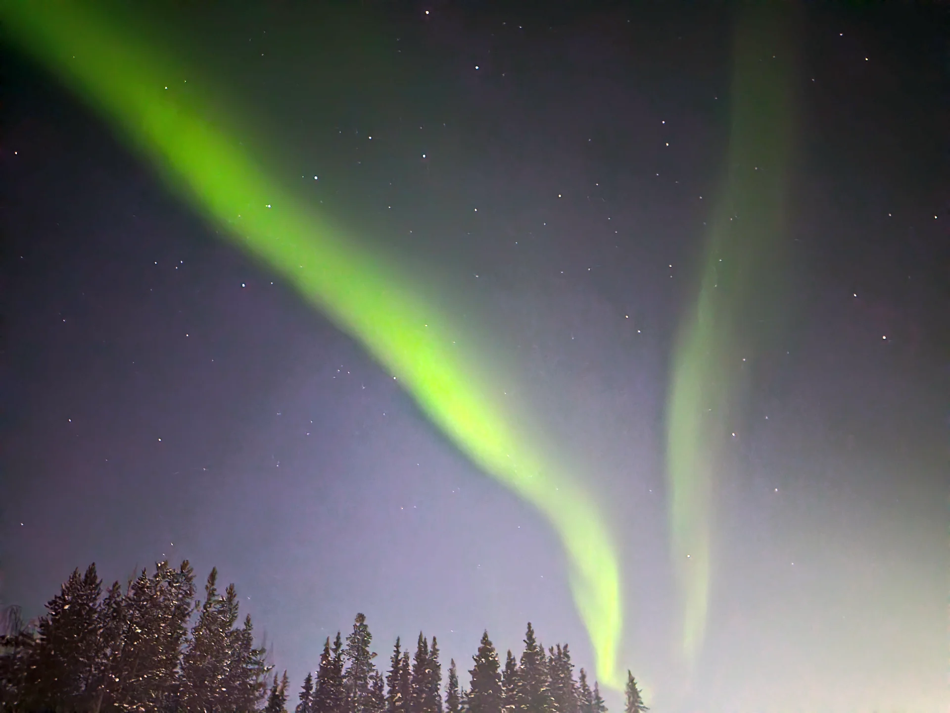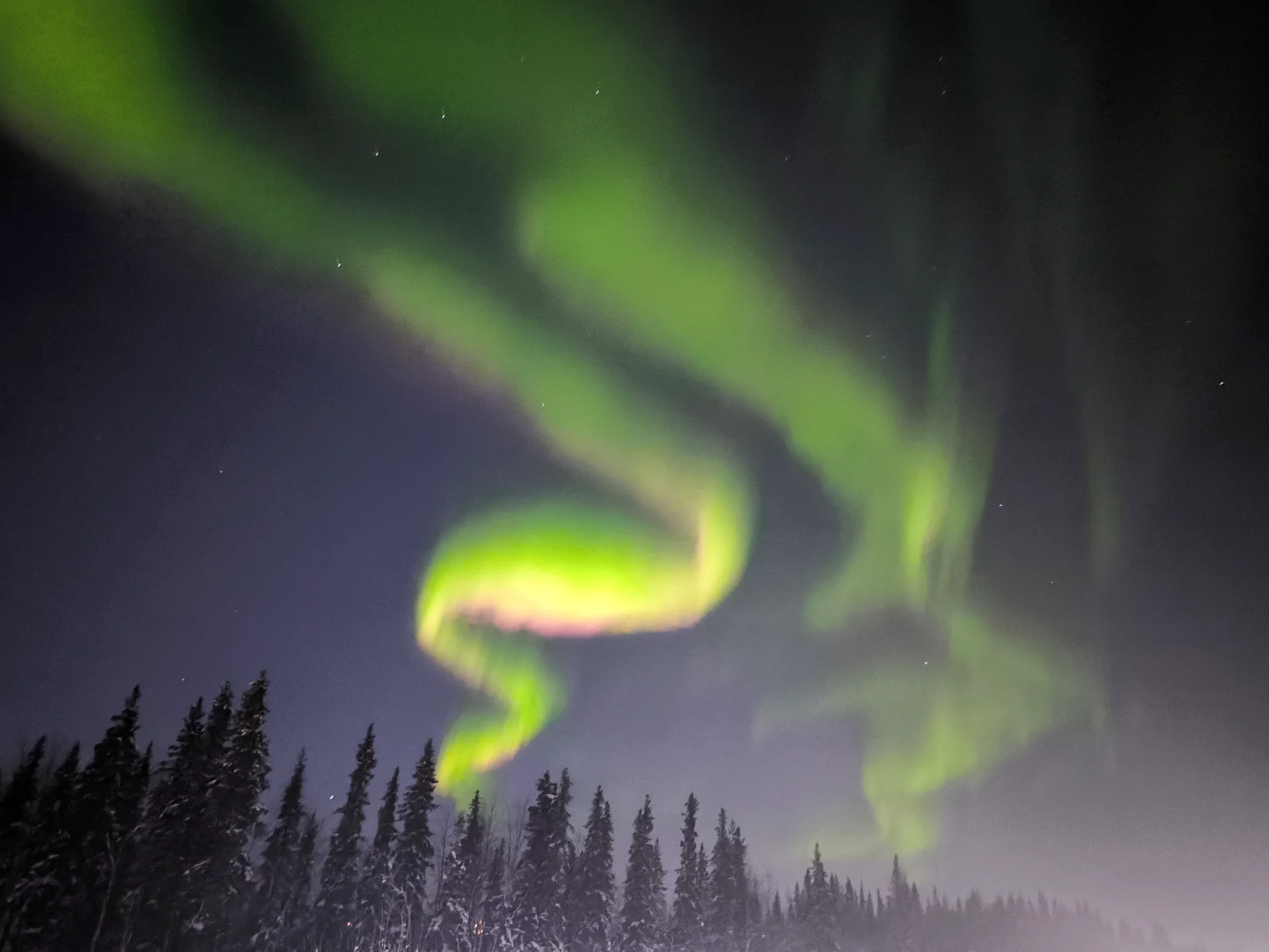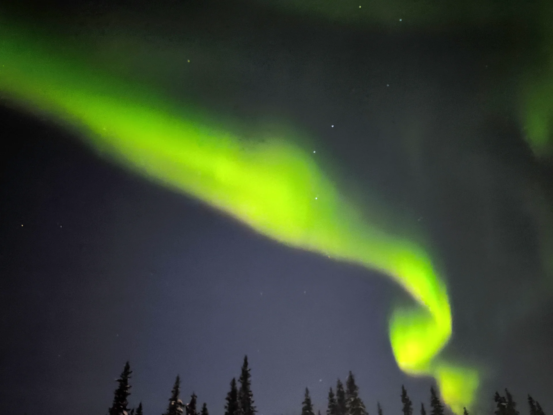 Keď bolo auto nabité, vyrazil som späť. Po pár minútach ma čakalo prekvapenie – polárna žiara. Bola však iná než tie predošlé. Tvoril ju jeden súvislý, meandrujúci pás, tiahnuci sa kilometre nad mojou hlavou. A ja som mal pocit, že jazdím pod nekonečnou zelenkastou riekou na oblohe.